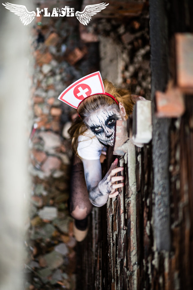 Несколько часов ведьмы, вампиры, кукла-зомби, мертвая невеста, монахини, амазонка, байкерша, медсестра, птица зла и даже Миссис Лавет позировали в мрачной атмосфере руин, и только вспышки камер озаряли темные помещения светом, а шутки и смех напоминали о веселом празднике.